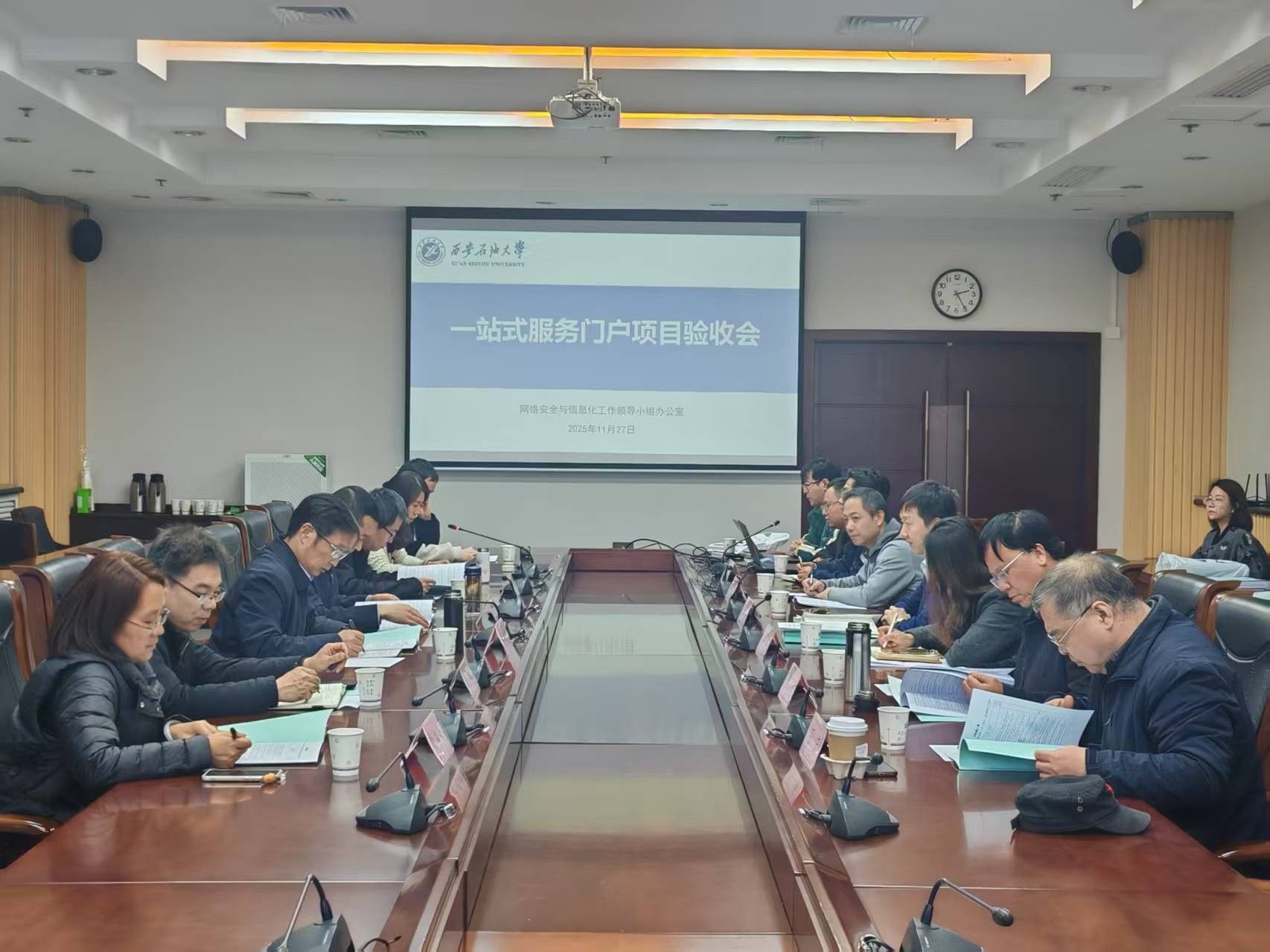 2025年11月27日,信息化建设与管理处在鄠邑校区第二会议室组织开展一站式服务门户项目验收会。该项目采用校银合作资金,是学校2025年年度重点工作任务之一,也是学校实施“提质增效”行动,全力提升持续发展动能的重要举措。